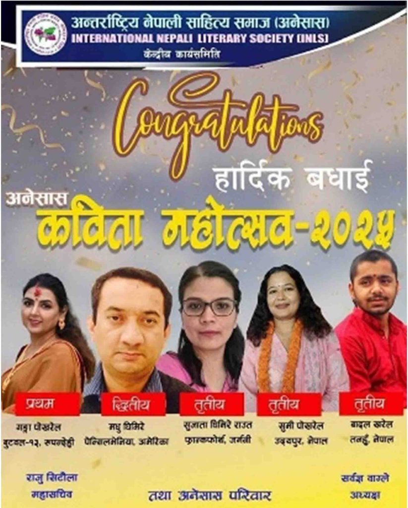 निर्णायक नारायण अधिकारीले एउटै पाठकले उही कविता बिहान, दिउँसो र बेलुका पढ्दा फरक फरक ढंगले बुझ्ने हुँदा कविता अनुभूतिसापेक्ष विधा भएको तर्क राख्नुभयो । उहाँले प्रतियोगितामा बुटवल नेपालकी गंगा पोखरेल प्रथम, ह्यारिसवर्ग अमेरिकाका मधु घिमिरे द्वितीय, फ्रयाङ्फर्ट जर्मनीकी सुजाता घिमिरे राउत , उदयपुर नेपालकी सुमी पोखरेल र तनहुँ नेपालका बादल खरेलले प्राप्ताङ्कका आधारमा तृतीय स्थान प्राप्त गरेको घोषणा गर्नुभयो ।