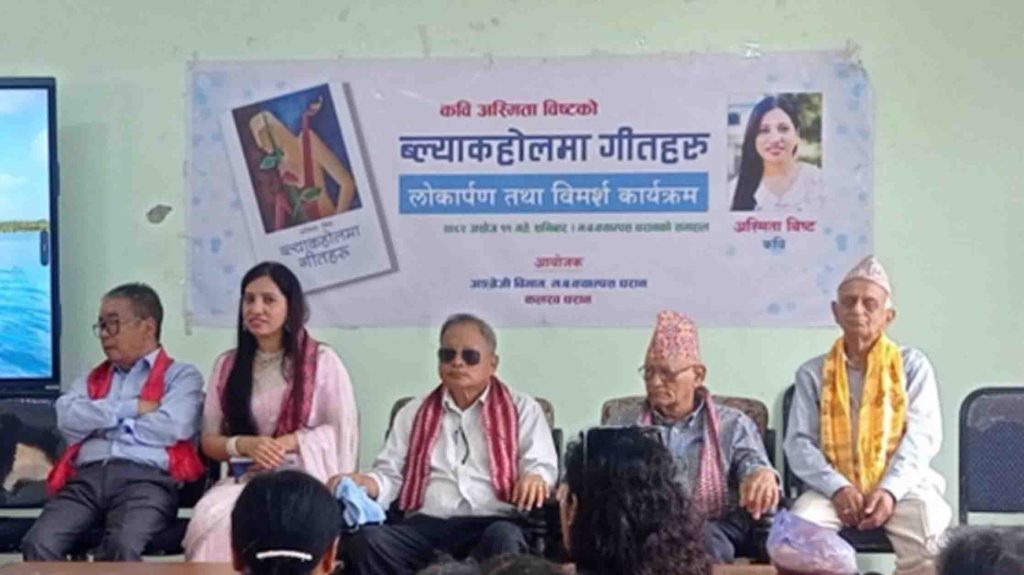 कवि डा. अस्मिता विष्टको पहिलो कविता- किताब ‘ब्ल्याकहोलमा गीतहरू’ धरानस्थित महेन्द्र बहुमुखी क्याम्पसमा विमोचन गरिएको छ । किताबको विमोचन प्रदेश-१ का पूर्वप्रमुख प्रा. डा. गोविन्दबहादुर तुम्बाहाङले गरेका थिए । ‘विष्टका कविताहरूले व्यक्तिगत रूपमा मलाई प्रभावित पारयो,’ ‘यी कवितामा नयाँ समयको स्वाद अनुभव भेटिन्छ, उनले भने,।’