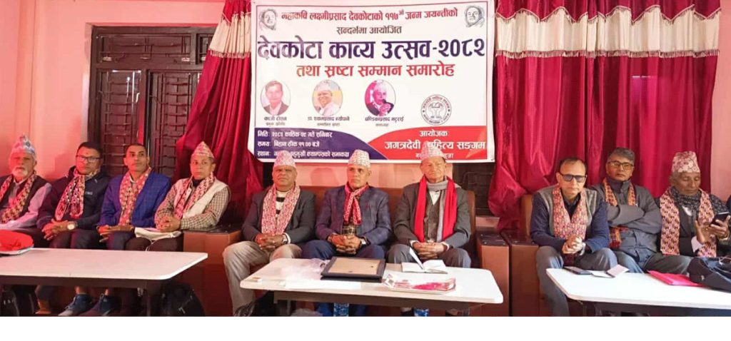 जगत्रदेवी साहित्य सङ्गम, गल्याङ, स्याङ्जाले महाकवि लक्ष्मीप्रसाद देवकोटाको ११७ औं जन्मजयन्तीको सन्दर्भमा ‘देवकोटा काव्य उत्सव– २०८२ तथा स्रष्टा सम्मान समारोह’ आयोजना गरेको छ । गल्याङ बहुमुखी क्याम्पस, स्याङ्जामा धवलागिरि साहित्य प्रतिष्ठानका अध्यक्ष वरिष्ठ साहित्यकार काजी रोशनको प्रमुख आतिथ्यमा कार्यक्रम भएको हो ।