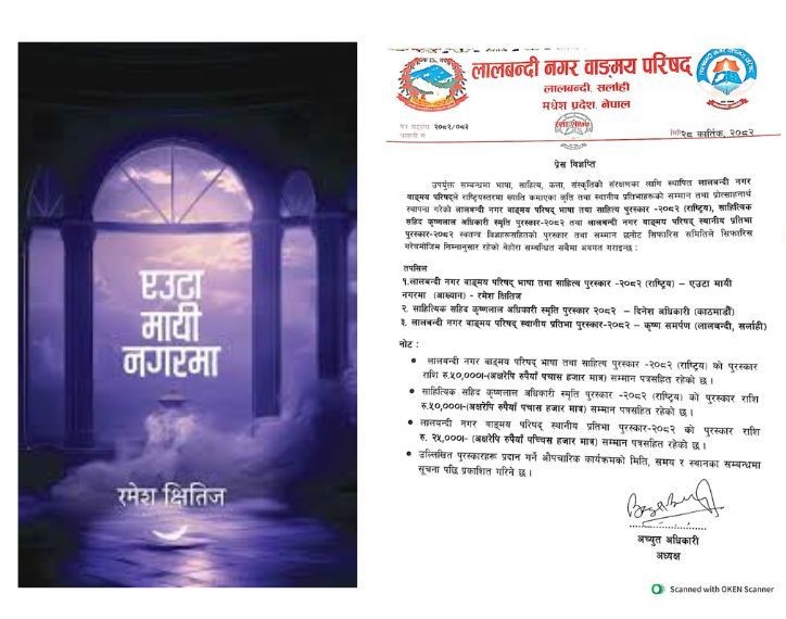 लालबन्दी नगर वाङ्मय परिषद्, लालबन्दीले ‘लालबन्दी नगर वाङ्मय परिषद् भाषा तथा साहित्य पुरस्कार–२०८२’ साहित्यकार रमेश क्षितिजको आख्यान ‘एउटा मायी नगरमा’ लाई प्रदान गर्ने निर्णय गरेको छ ।