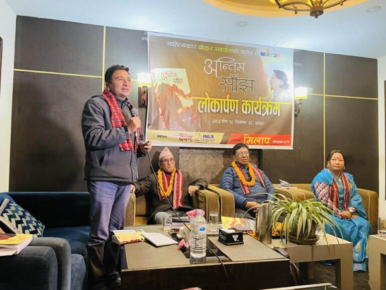 मिलाप पब्लिकेशनको आयोजना तथा अनेसास दर्पणको संयोजनमा आइतवार ललितपुर कुमारीपाटीस्थित ऐला लाउन्जमा आयोजित एक विशेष कार्यक्रमका प्रमुख अतिथि नेपाल स्रष्टा समाजका अध्यक्ष वरिष्ठ साहित्यकार श्रीओम श्रेष्ठ ‘रोदन’ थिएभने कृतिमाथि समीक्षा प्रगति राई, कीर्तिमानी सङ्गीतकार तथा उपन्यासकार सन्तोष श्रेष्ठ, लगायतले गरेका थिए ।