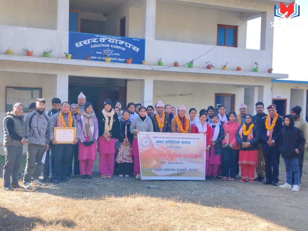 तेह्रथुमको छथर क्याम्पसमा कविता वाचन कार्यक्रम सम्पन्न भएको छ । छथर साहित्यिक समाज, शुक्रबारे (तेह्रथुम)को आयोजना तथा स्वतन्त्र विद्यार्थी युनियनको समन्वयमा सम्पन्न सो कार्यक्रममा क्याम्पसमा अध्ययनरत विद्यार्थीहरूको सक्रिय सहभागिता रहेको कुरा समाजका सचिव रोशन यात्रीले जानकारी दिनुभएको छ । साहित्यिक चेतनाको अभिवृद्धि गर्ने उद्देश्यसहित तेह्रथुम जिल्लाको छथर गाउँपालिकास्थित छथर क्याम्पसमा सम्पन्न सो कार्यक्रम विद्यार्थीहरूलाई सिर्जनात्मक लेखनतर्फ प्रेरित गर्ने उद्देश्यले आयोजना गरिएको थियो ।