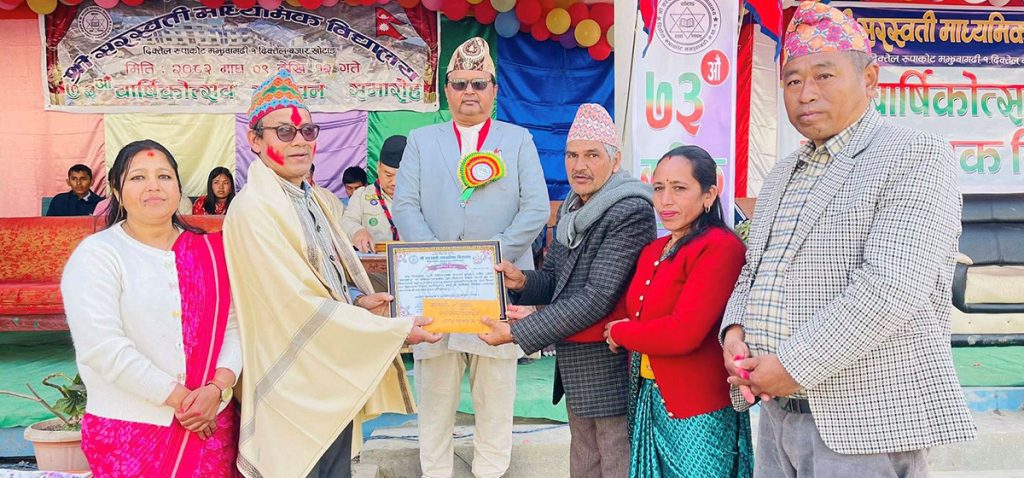 उक्त कार्यक्रममा सम्मानित व्यक्तित्व शिक्षक रामविक्रम थापाले सम्पादन गरेको विद्यालयको वार्षिक मुखपत्र ‘सरस्वती–५’ को पनि लोकार्पण भएको छ । शिक्षासेवी रिजालले मुखपत्रको लोकार्पण गरेका हुन् । साहित्यकार नइन्द्र खत्रीले लोकार्पित मुखपत्र ‘सरस्वती–५’ को समीक्षात्मक टिप्पणी गरेका थिए । साहित्यकार थापाका पात्रहरू (लघुकथासंग्रह, २०५५), छरिएका कविता (कवितासंग्रह, २०५६), बालपोष (बालकवितासंग्रह, २०६४), राम्रो बानी (बालकवितासंग्रह, २०७३) लगायतका दर्जनौ कृति प्रकाशित छन् । शिक्षक चन्द्रकुमार श्रेष्ठको सञ्चालन गरेको कार्यक्रममा प्रधानाध्यापक शिवहरि ढकालले विद्यालयको वार्षिक प्रतिवेदन प्रस्तुत गरेका थिए । कार्यक्रममा विभिन्न अतिथिले शुभकामना मन्तव्य व्यक्त गरेका थिए ।