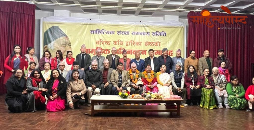 नेपाली भाषा, साहित्य, कला, संस्कृति तथा साहित्यिक पत्रकारितामा योगदान गर्दै आएका ५१ संस्थाको साझा मञ्च साहित्यिक संस्था समन्वय समितिले ९१ वर्षीय कवि द्वारिका श्रेष्ठको सामूहिक अभिनन्दन गरेको छ । नेपाल पर्यटन बोर्ड, भृकुटीमण्डपमा आयोजित समारोहमा श्रेष्ठलाई कदबराबरको अभिनन्दनपत्र समर्पण गरिएको थियो । समितिका अध्यक्ष तथा साहित्यिक पत्रकार संघका अध्यक्ष राधेश्याम लेकालीको अध्यक्षतामा सम्पन्न कार्यक्रममा श्रेष्ठलाई दोसल्ला, दूबो, फूल तथा रुद्राक्षको माला, टोपी, टीका, सगुन र फूलवर्षासहित अभिनन्दन गरिएको थियो ।