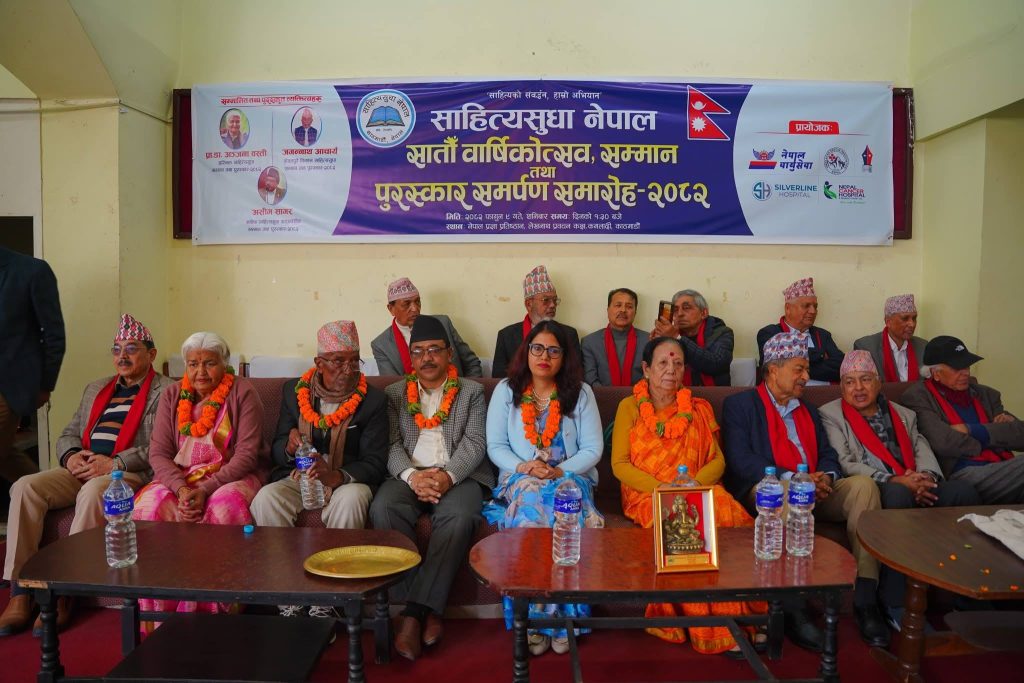साहित्यिक संस्था साहित्यसुधा नेपालले आफ्नो सातौँ वार्षिकोत्सवका अवसरमा आज काठमाडौंमा तीन स्रष्टालाई सम्मान तथा पुरस्कार प्रदान गरेको छ। नेपाल प्रज्ञा प्रतिष्ठानको लेखनाथ प्रवचन कक्षमा आयोजित कार्यक्रममा प्रा.डा. अञ्जना वस्तीलाई हरिभक्त साहित्यसुधा सम्मान तथा पुरस्कार–२०८२, कवि जगन्नाथ आचार्यलाई केवलपुरे किसान साहित्यसुधा सम्मान तथा पुरस्कार–२०८२ तथा कवि असीम सागरलाई मनीषा साहित्यसुधा सङ्घर्षशील सम्मान तथा पुरस्कार–२०८२ प्रदान गरिएको हो ।