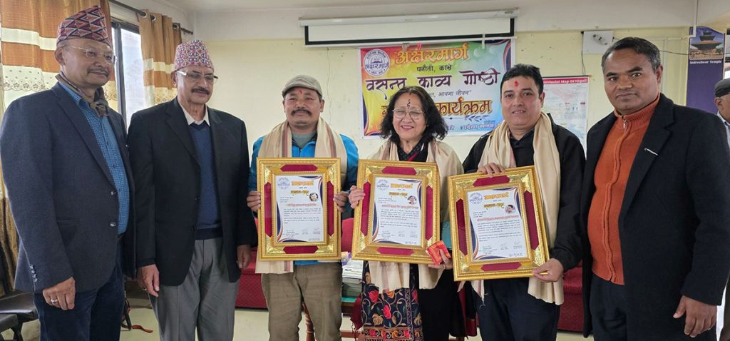 पनौतीमा भएको ‘वसन्त काव्य गोष्ठी’ अक्षरमार्गले तीन स्रष्टालाई सम्मान गरेको छ । अक्षरमार्गको आयोजनामा पनौतीमा सम्पन्न ‘वसन्त काव्य गोष्ठी तथा सम्मान कार्यक्रम’मा तीन स्रष्टालाई सम्मान गरिनुका साथै तीन दर्जनभन्दा बढी कविहरूले काव्यवाचन गर्दै वसन्तलाई शब्द र भावमार्फत जीवन्त बनाएका छन् । यस वर्ष ‘कृष्णसुन अक्षरमार्ग काव्य सम्मान’ साहित्यकार हरिसुन्दर छुकांलाई, ‘श्रीराम जगतमाया अक्षरमार्ग साधक सम्मान’ पत्रकार सुकृत नेपाललाई तथा ‘कमानसिंह तुलसा स्रष्टा सम्मान’ शैली साहित्य समाजकी मञ्जुश्री प्रधानलाई प्रदान गरिएको हो । सम्मानित व्यक्तित्वहरूको योगदान, साहित्यिक यात्रा र समाजमा पु¥याएको प्रभावबारे कार्यक्रममा विस्तृत चर्चा गरिएको थियो ।