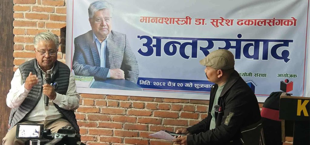 मानवशास्त्री डा. सुरेश ढकालसँग इतिहास, मानवशास्त्र, संस्कृति तथा समसामयिक समाजका बहुआयामिक विषयमा केन्द्रित अन्तरसंवाद भएको छ । बुक क्लब, भक्तपुरले ‘इतिहासअघिको इतिहास’ कृतिमा केन्द्रित रही कार्यक्रम गरेको हो । उक्त कार्यक्रममा इतिहासको स्वरूप, ज्ञान उत्पादन, संस्कृति, पहिचान र विकासका प्रश्नहरूलाई लिएर बौद्धिक बहस गरिएको थियो । डा. सुरेश ढकालले ‘मान्छे’ लाई बुझ्न जैविक आधार मात्र पर्याप्त नहुने उल्लेख गर्दै सामाजिक, सांस्कृतिक र राजनीतिक सन्दर्भसँगै विश्लेषण गर्नुपर्ने धारणा राखे । उनले इतिहासलाई विगतको स्थिर अभिलेखका रूपमा नभई वर्तमान समाज बुझ्ने सशक्त उपकरणका रूपमा व्याख्या गरे। ‘इतिहास कसले लेख्छ र कसको कथा छुट्छ भन्ने प्रश्न सधैं शक्ति र राजनीतिसँग गाँसिएको हुन्छ’, उनले भने ।