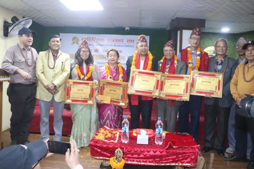 साहित्यिक पत्रकार सङ्घ ले आज ४५ औं कथा दिवसको अवसरमा सम्मान एवं पुरस्कार समर्पण समारोहको आयोजना ग¥यो । सो अवसरमा भवानी साहित्यिक पत्रकारिता सम्मानबाट साहित्यिक पत्रकार रमेश पोखरेल (कार्यकारी सम्पादक, शब्द संयोजन मासिक) र साहित्यिक पत्रकार प्रवीण जोशी (शृङ्खला साहित्यिक मासिकको संपादक÷प्रकाशक), लोकप्रिया पुरस्कारबाट साहित्यकार प्रतिसरा सायमि, व्यथित काव्य सम्मानबाट कविहरू विमला तुम्खेवा र मीनकुमार श्रेष्ठ ’नवोदित’ सम्मानित र पुरस्कृत हुनुभयो । आजै व्यथित काव्य डायस्पोरा सम्मानबाट सम्मानित गरिने घोषणा गरिएका कविहरू लालगोपाल सुवेदी र दीपा राई पुन अमेरिकामा रहनु भएकोले पछि प्रदान गरिने भएको छ ।