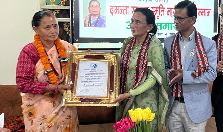 उदयपुरकी स्रष्टा मालावती काफ्ले लाई ‘दमन्ता खनाल स्मृति नारी स्रष्टा सम्मान’ अर्पण गरिएको छ । नेपाल स्रष्टा समाजले हरेक वर्ष प्रदान गर्दै आएको उक्त सम्मान बुधबार काठमाडौंमा आयोजित समारोहबीच प्रदान गरिएको हो । कार्यक्रमका प्रमुख अतिथि भागिरथी श्रेष्ठ, पुरस्कार संस्थापकको तर्फबाट प्रतिनिधित्व गर्ने इन्द्रकुमारी खनाल, समाजका पूर्वअध्यक्ष विधान आचार्य तथा साहित्यिक पत्रकार संघका अध्यक्ष राधेश्याम लेकाली लगायतले काफ्लेलाई सम्मान अर्पण गर्नुभएको हो ।